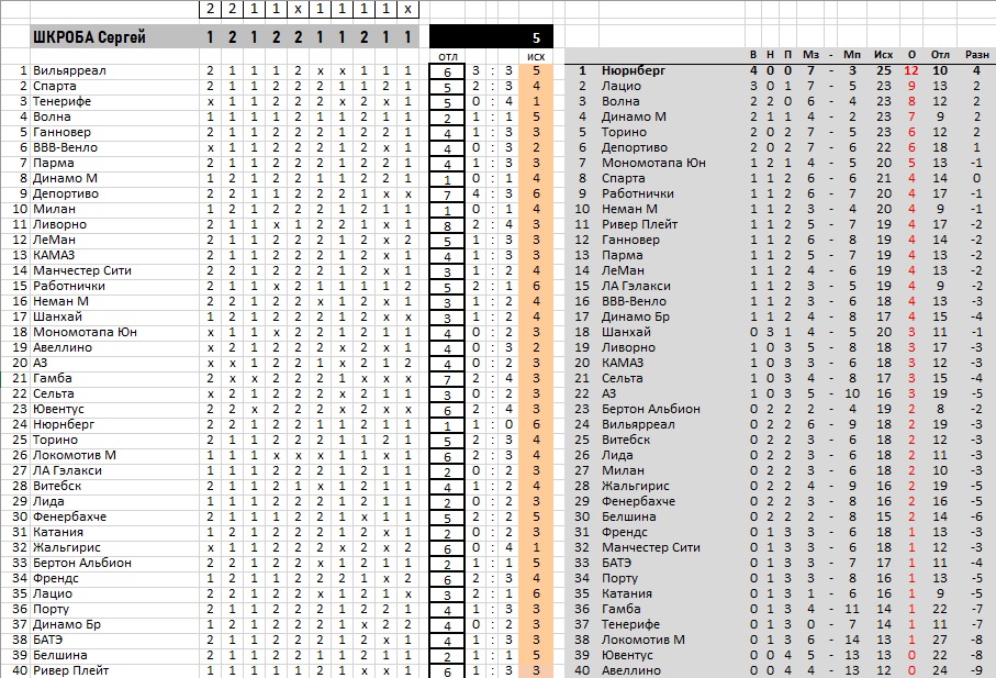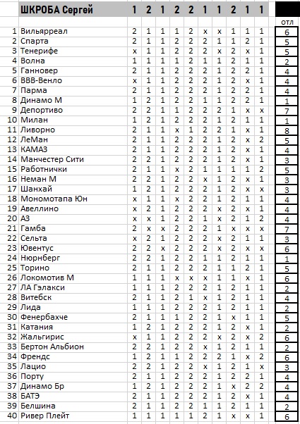 СПАРРИНГПАРТНЕР - ОБЛАДАТЕЛЬ КУБКА SERIE А - C.ШКРОБА Угадал 5 исх. Сыграл 40 матч, в которых одержал 31 победу, 5 матчей завершил вничью и 4 матча проиграл. Мячи 96-42. Набрал 98 оч, что составило 81,67% от возможного количества.